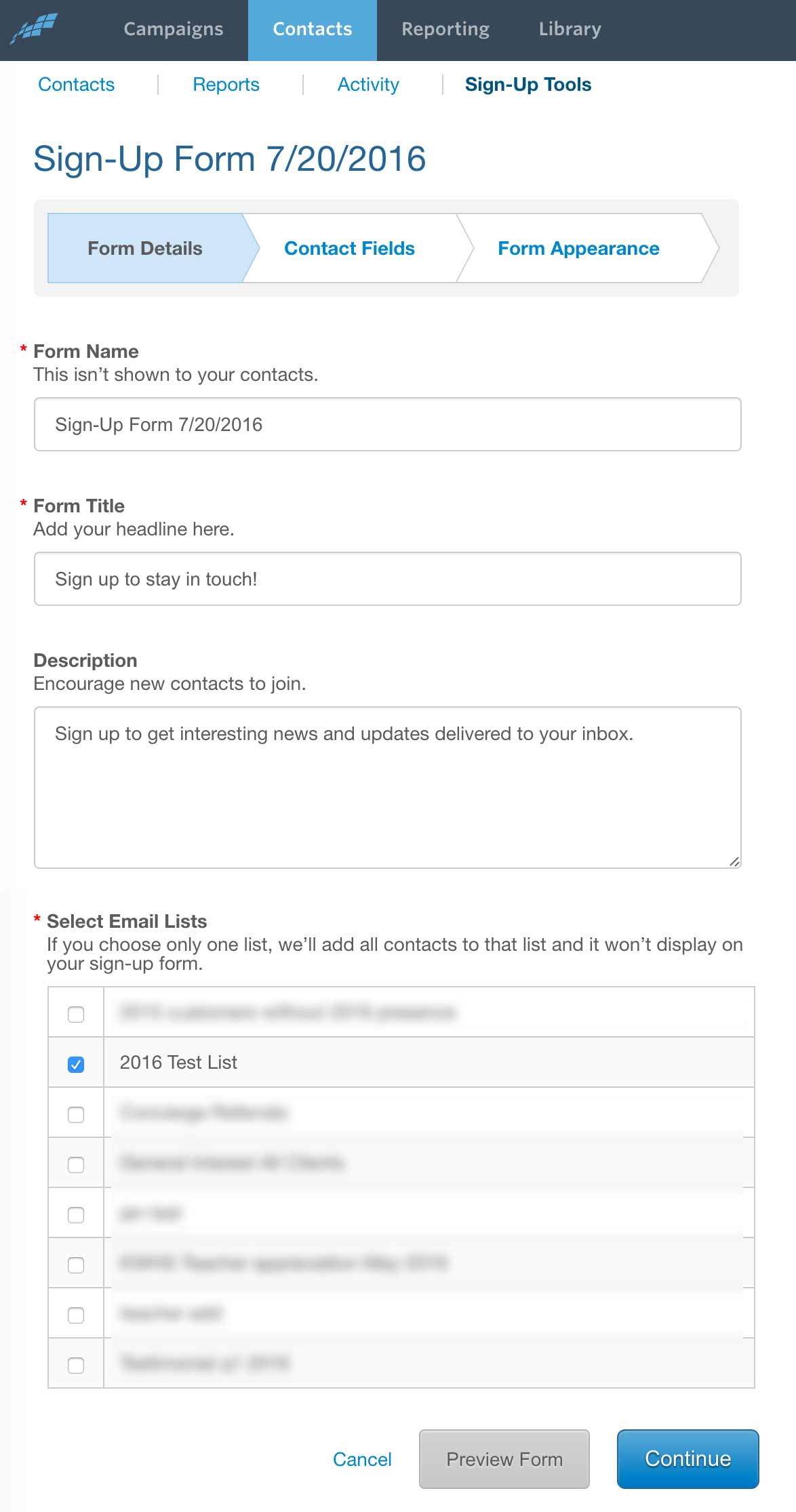 Login to your account at Constant Contact and then go to Contacts > Sign-Up Tools and click on the large golden button on the upper right that says “Create a Sign-Up Form”. We are just creating this form to get information from CC to use in our plugin so we don’t need to worry about the Form Name, Form Title or Description fields (you can leave them to whatever they default to). You do, however, need to select the box for the list(s) you want people added to when they signup from the eNews Extended widget we are creating. For my example I am using the list “2016 Test List”. Press Continue.