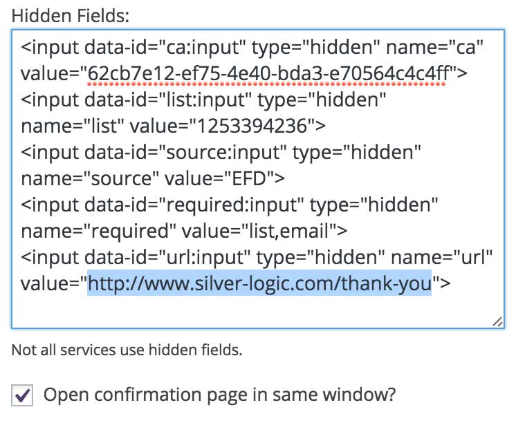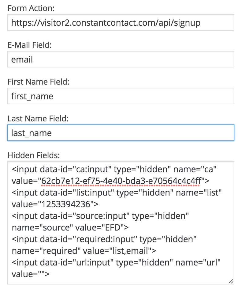 We now need to copy all the <inputs> that are hidden so that your data will be properly parsed when sent to Constant Contact (this also contains the ID of your list and your account and that is why you need to create the new signup form in step 1 as this information is unique to each account!). In my example that info is on Lines 13-17, you need to copy that from your own embed code into the “Hidden Fields” box in your widget.